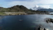 Aerial of landscape near Ballstad, Lofoten archipelago with cod drying on racks - 4K 映像素材
