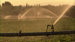 Close up of a sprinkler irrigating the potato field, with other sprinklers in the background. - HD 映像素材