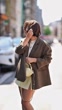 COLOGNE, GERMANY - APRIL 30: (SLOW-MO) Franziska König is seen wearing a cropped oversized t-shirt in white chocolate noted in the front with the print "You are my favourite snack" in dark brown from Hernameis x Toffifee, a skorts in butter yellow from Zara, a yellow mini Bou bag from Ganni, an oversized blazer in chocolate brown from The Frankie Shop, oversized brown retro sunglasses in squared aviator style from Kapten & Son, heart shaped earrings in silver and bold, silver hoops and Soleil necklace made from citrine stones, baroque pearls, a silver chain necklace, a necklace with pearl pendant, stacked silver rings and a silver chain bracelet from Fafe Collection on April 30, 2025 in Cologne, Germany. (Footage by Moritz Scholz/Getty Images)