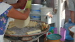 Medium close-up shot real time of female hands of vendors arranging and cooking flautas on hot grill at street taco stand in Oaxaca