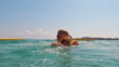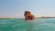 Caucasian mother and son playing on summer vacations. They wear life vests and slide down the inflatable game into the sea.