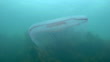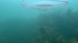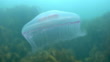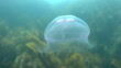 Jellyfish swimming against a kelp forest background in the Lofoten archipelago, Norway