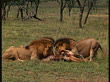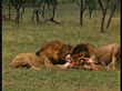 Medium shot three lions feeding on the carcass of an animal w/trees in background - 映像素材
