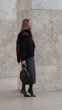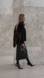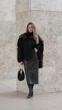 PARIS, FRANCE - DECEMBER 13: (SLOW-MO) Natalia Verza wears long straight blonde hair with a center part, makeup featuring a natural complexion with pink lipstick, a black wool bomber jacket with a dark brown fur-trimmed front panel by Bompard, a black midi-length leather skirt by Bompard with a straight silhouette, a small black leather handbag with gold handle handle, and black patent leather pointed-toe heels by Giuseppe Zanotti, during a street style fashion photo session, on December 13, 2025 in Paris, France. (Footage by Edward Berthelot/Getty Images)
