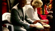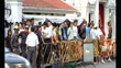 Prince of Wales and Duchess of Cornwall visiting Bob Marley Centre in Jamaica; **NOTE: Poor picture quality throughout**JAMAICA: Kingston: Rose Town:EXTCrowds and police waiting behind barricade Prince Charles, Prince of Wales, and Camilla, Duchess of Cornwall (wearing loose white dress with frilly collar and carrying yellow parasol) along with others, chatting to musicians singing and playing bongos (not heard) then joining in playing bongos SOT
