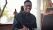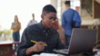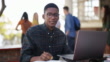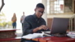 一人で座って勉強するためにラップトップを使用してハンサムな若い学生の4kビデオ映像