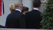 Royal Wedding: Queen hosts party at Mandarin Oriental Hotel; Prince and Princess Michael of Kent arriving followed by son Lord Frederick Windsor and his wife Sophie Winkleman, Lady Frederick Windsor / Exiled King of Greece, Constantine kissing the hand of Princess Michael of Kent then greeting others / Exiled Queen Anne-Marie of Greece also greeting the Kent family / More guests getting off coach (mini-bus) including Princess Anne, the Princess Royal and her husband Vice Admiral Tim Laurence followed by her daughter Zara Phillips and her fiancee rugby player Mike Tindall and her son Peter Phillips and his wife Autumn Phillips / Sultan of Brunei Hassanal Bolkiah and his wife Pengiran Anak Hajjah Saleha, Queen of Brunei out of car and into hotel (mostly obscured) / Prince Philip, the Duke of Edinburgh and Queen ELizabeth II out of car / Queen and Duke greeted by Lady Anson and into hotel