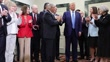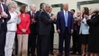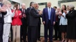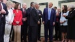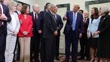 WASHINGTON, DC - JUNE 13: Republican presidential candidate, former U.S. President Donald Trump is flanked by Sen. Katie Britt (R-AL) (2R), Sen. Lindsey Graham (R-SC) (C-L), Sen. Joni Ernst (R-IA) (R) and other Senate Republicans as he gives remarks to the press at the National Republican Senatorial Committee building on June 13, 2024 in Washington, DC. Trump is visiting Capitol Hill to meet with House and Senate Republicans.(Footage by Anna Moneymaker/Getty Images)