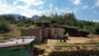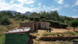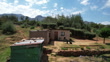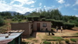 Schoolgirl leaving her house to go to school being greeted by her mother in rural African setting. She has a backpack on her back. She gives her mother a hug and wave goodbye. Malealea, Lesotho.