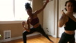 MS Woman in revolved side angle pose while practicing yoga with friend in home - 4K 映像素材