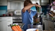 A young boy making a Juice with a slow juicer, at home on the kitchen table. - 4K 映像素材