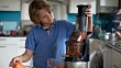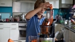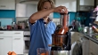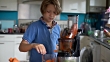A young boy making a Juice with a slow juicer, at home on the kitchen table. - 4K 映像素材